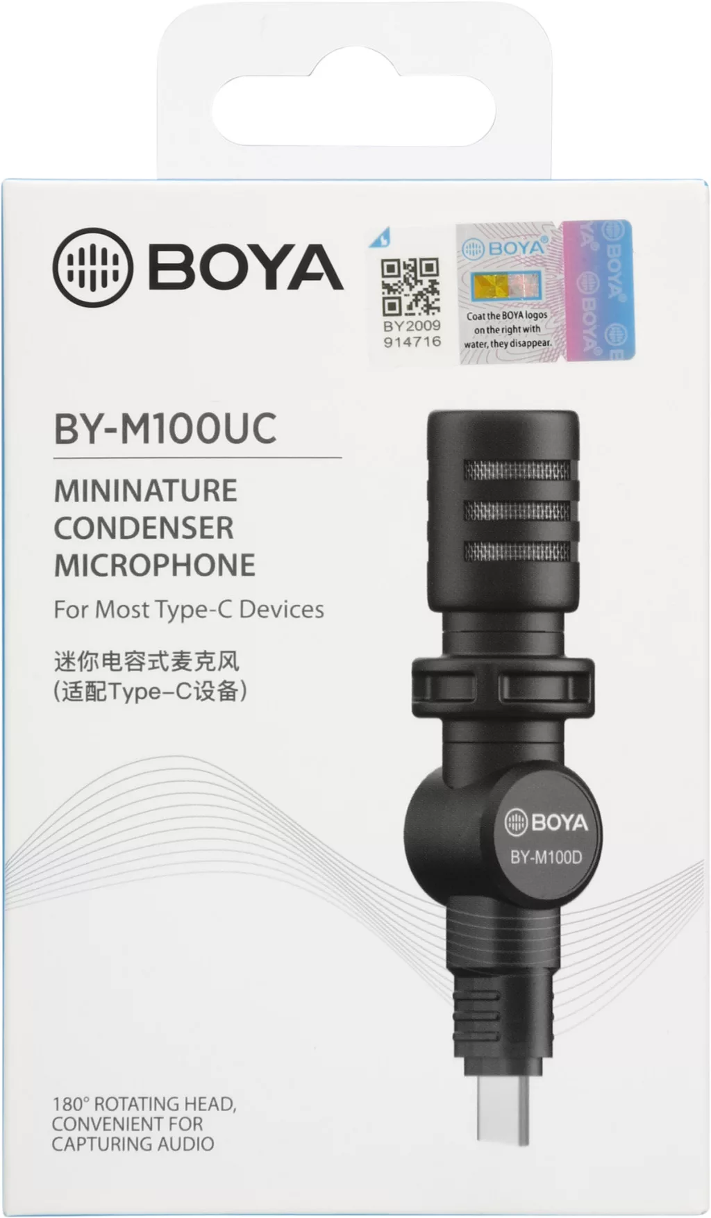 A BY-M100UC egy miniatűr méretű, minden irányú mikrofon a legtöbb okostelefonhoz vagy Type-C csatlakozóval rendelkező készülékhez, amely javítja a hangminőséget a videókészítés során. 180°-ban forgó fej, szabadon rögzíti a hangot A 180°-ban forgó fej kialakításával a BOYA BY-M100UC különböző szögből rögzítheti a hangot, így szabadjára engedve a benne rejlő lehetőségeket.
