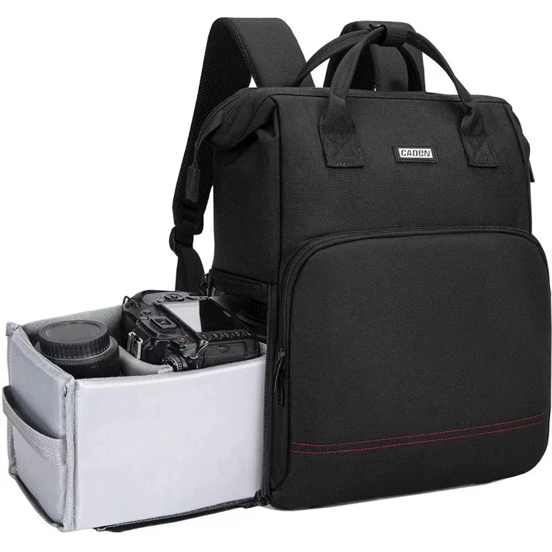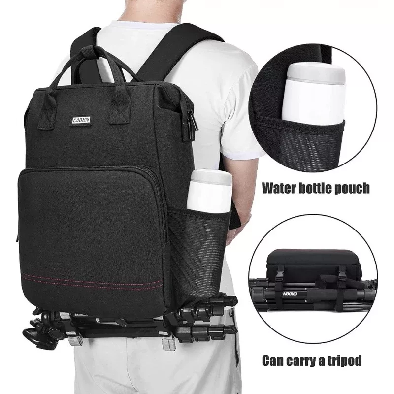 CaDen professzionális fényképezőgép hátizsák, 18 literes férőhellyel a kamerának, objektíveknek és egyéb kiegészítőknek. A fekete Caden D43 egy fényképezőgép hátitáska és szabadidő hátizsák kombinációja kemény és tartós külsővel és párnázott ütésálló belsővel védi a fényképezőgépet a sérülésektől, a por és a karcolások ellen. Alsó rekesze kicsúsztatható. Ez a Caden fényképezőgép hátizsák kiváló védelmet nyújt a DSLR fényképezőgép számára objektívvel és tartozékokkal. Memóriahab belseje, amely megvédi a kényes kütyüket; kivehető elválasztók a testreszabható belső kialakítás érdekében; SLR és DSLR fényképezőgépekkel is kompatibilis.