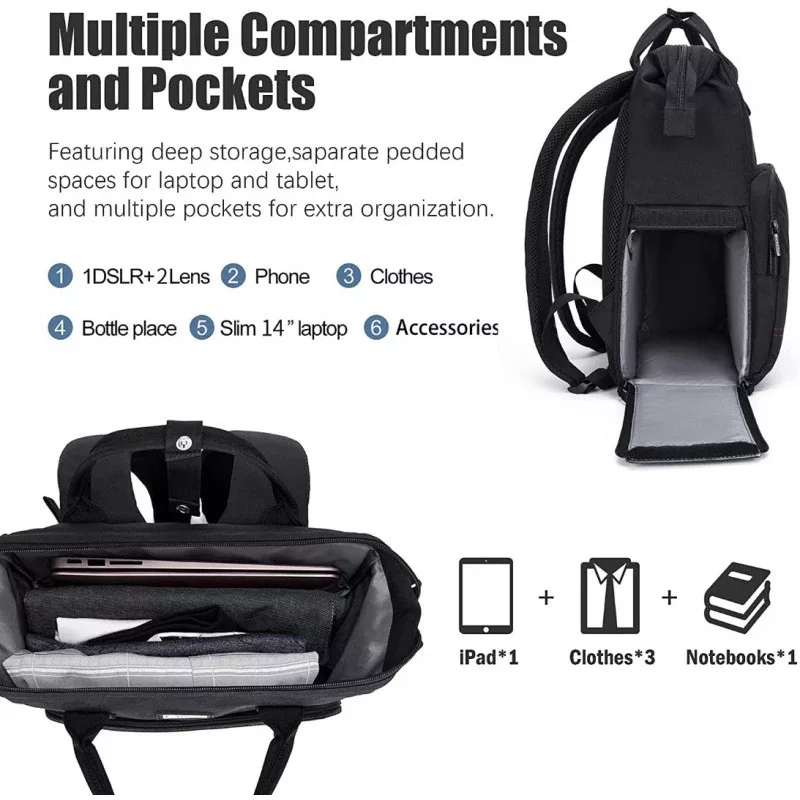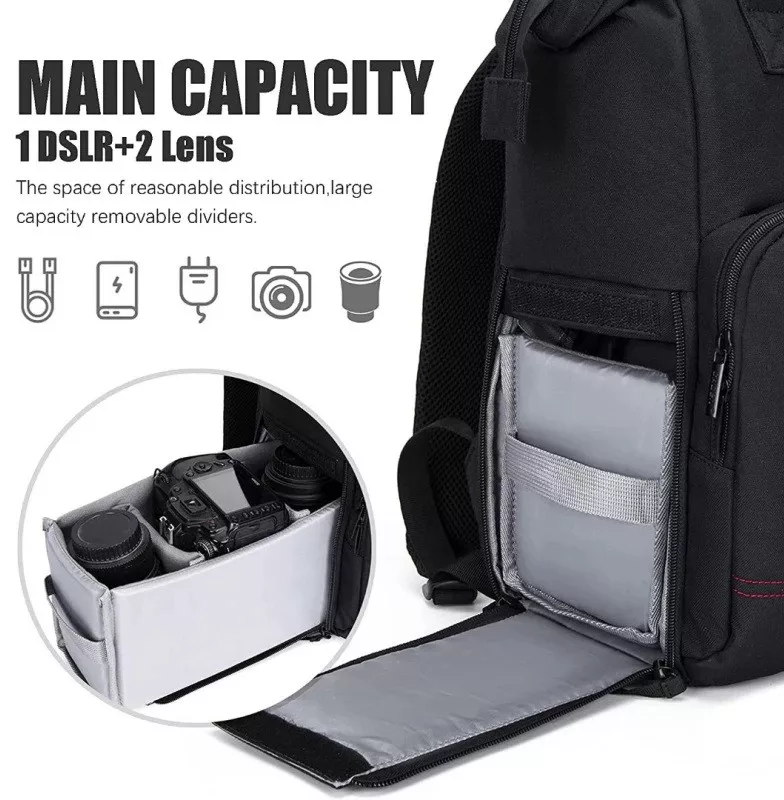 Professzionális DSLR, kamera fényképezőgép hátizsák két külön rekeszes design, nagy űrtartalmú 18 literes férőhellyel a kamerának, objektíveknek és egyéb kiegészítőknek. Vízálló 30*14*41 cm vízálló és esőálló hátizsák. 1 db DSLR + 3-4 db lencsének elég férőhely + 14-15" laptop hely, illetve felső rekesz ruháknak, fotós termékeknek. Kivehető alsó kamera tartó rekesz.