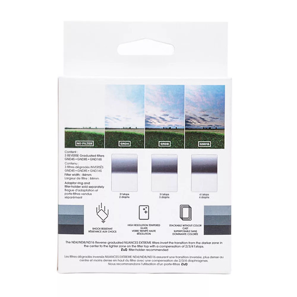 Ez a Cokin Nuances Extreme Reverse Kit P sorozat három darab Cokin P sorozatú full ND szürke szűrőből álló készlet. A csomag ideális táj- és természetfotózáshoz, és 2 év garanciát tartalmaz. Cokin Nuances Extreme Reverse Kit P serie bestaat uit: R GND4, R GND8 én R GND16, amely megerősíti a készlet alkotórészeit több nyelven is. A készlet pontosan a következő elemeket tartalmazza: