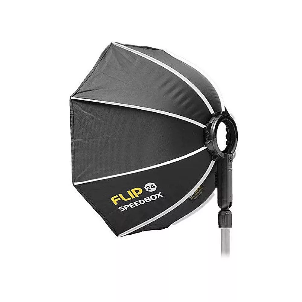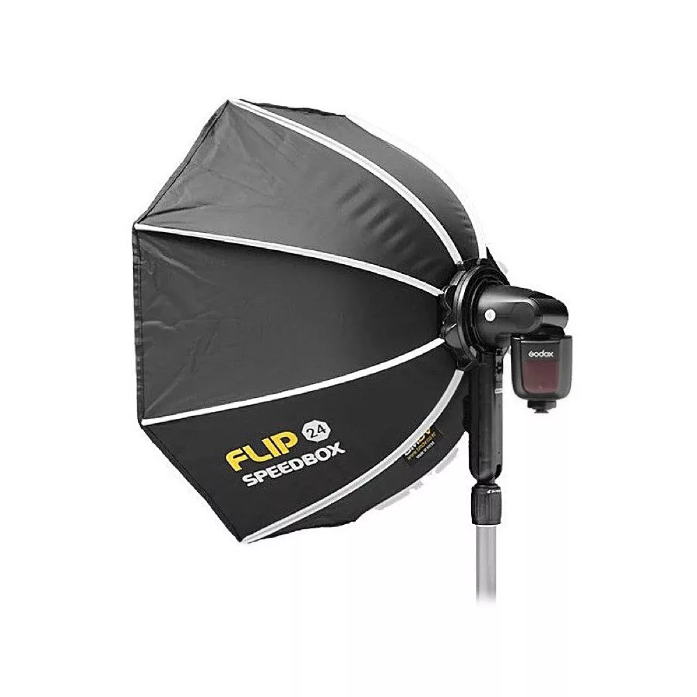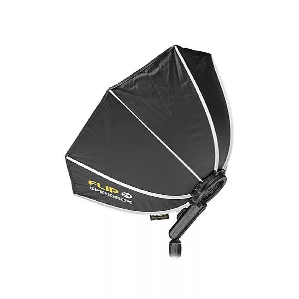 Az SMDV Speedbox Flip-24 softbox egy rendkívül gyorsan beállítható, nyolcszögletű softbox. A Flip-24 átmérője 55 centiméter, és praktikus összecsukható rendszerrel van felszerelve, amely lehetővé teszi a gyors ki- és összecsukását. Egy praktikus hordtáskában érkezik.