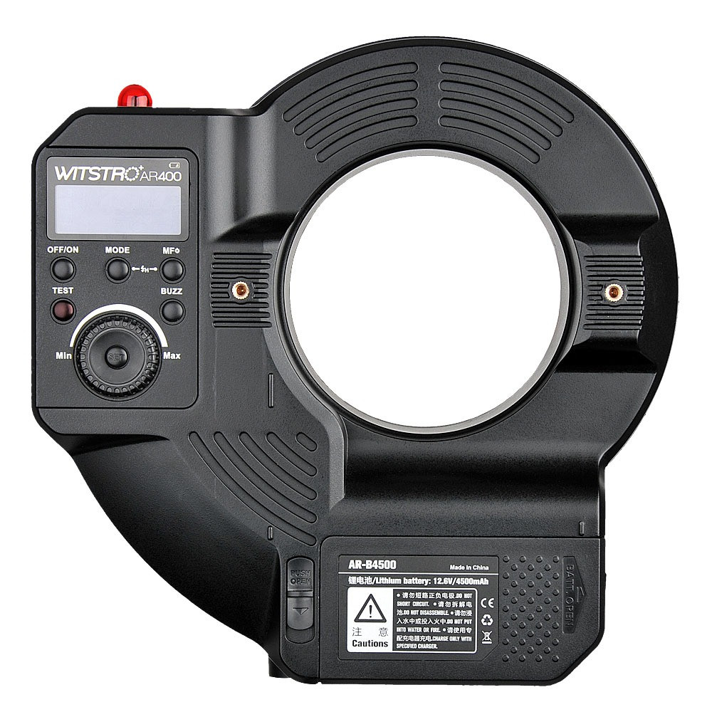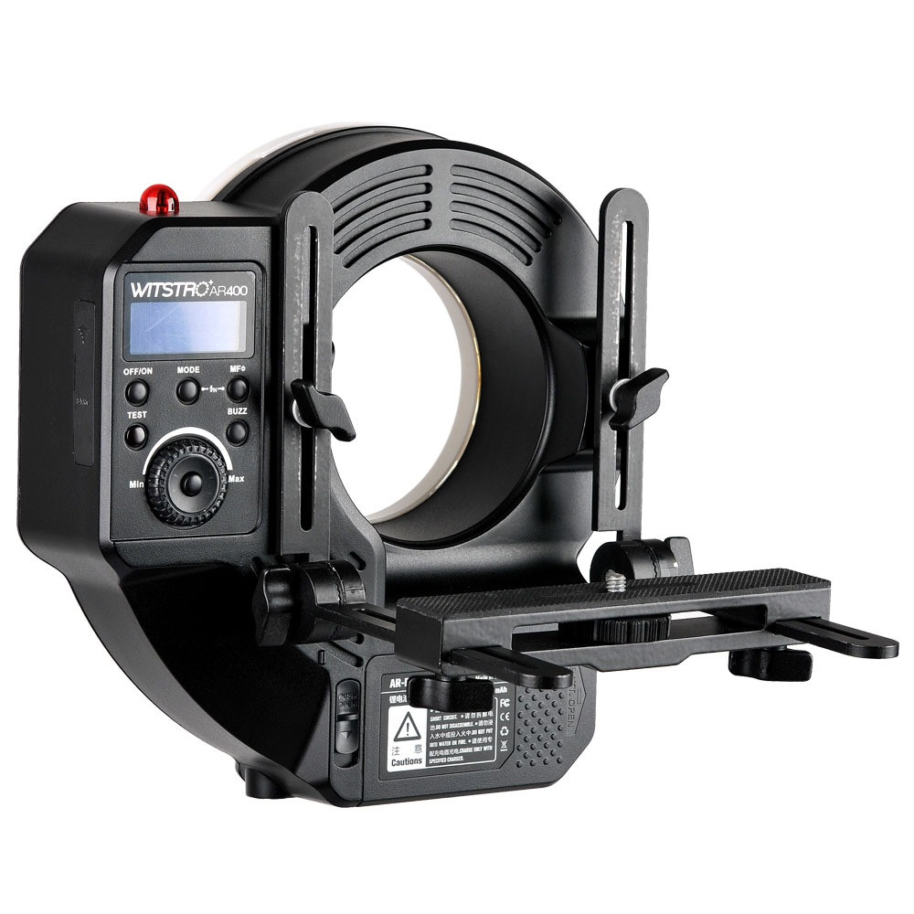 A Witstro AR400 vaku teljesítménye 400 Ws, fényereje pedig 22 lépésben állítható. A gyűrűs vaku támogatja az S1/S2 slave triggerelést, az RPT stroboszkópos vakut, a nagy sebességű szinkront és még sok mást. Az AR400 egy professzionális lítium akkumulátorral működik, amelynek kapacitása 4500 mAh, amely körülbelül 450 villanásra alkalmas teljes teljesítményen. A 0,05-2,8 másodperces újrafeldolgozási idő szupergyors. Az akkumulátor töltéséhez tartozik egy akkumulátortöltő.