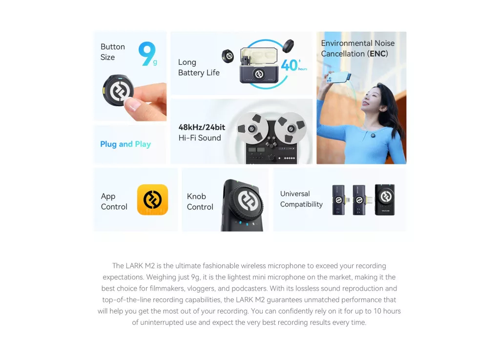 A Hollyland LARK M2 USB-C adóegység a professzionális hangrögzítés minden igényét kielégíti, miközben könnyű és hordozható marad. A 48kHz/24bit Hi-Fi hangminőség, a környezeti zajszűrés és a hosszú üzemidő biztosítja a zavartalan felvételeket bármilyen környezetben. Egyszerű használata és intuitív kezelhetősége ideális választássá teszi vloggerek, filmesek és mobil tartalomkészítők számára. A teljes csomag minden szükséges tartozékot tartalmaz, így a felvételek kezdettől a lehető legjobb minőségben készülhetnek.
