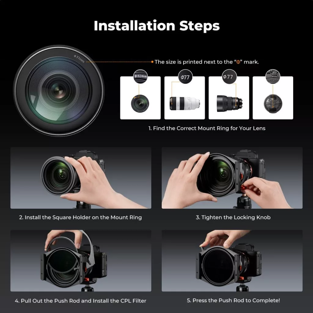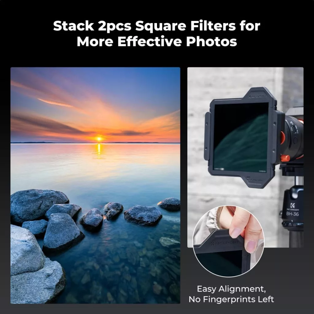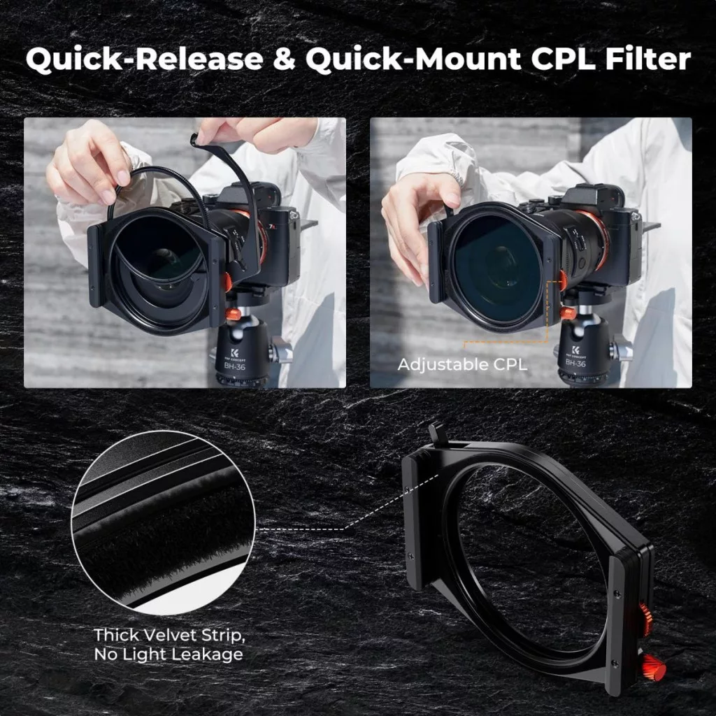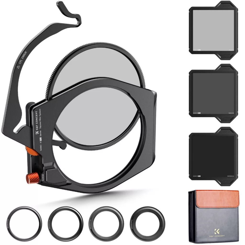 K&F Concept négyzet alakú szűrőtartó rendszer Pro készlet – szűrőtartó + 95 mm-es kör CPL szűrő + ND1000 + ND8 + ND64 + 4 db adaptergyűrű – Nano-Xcel Pro szűrőcsomag fényképezőgéphez