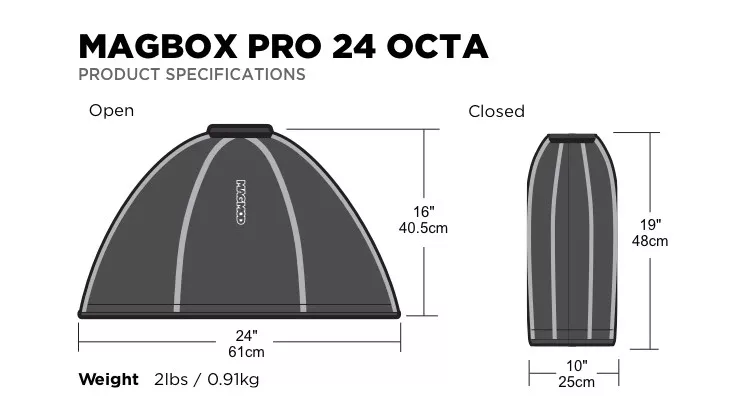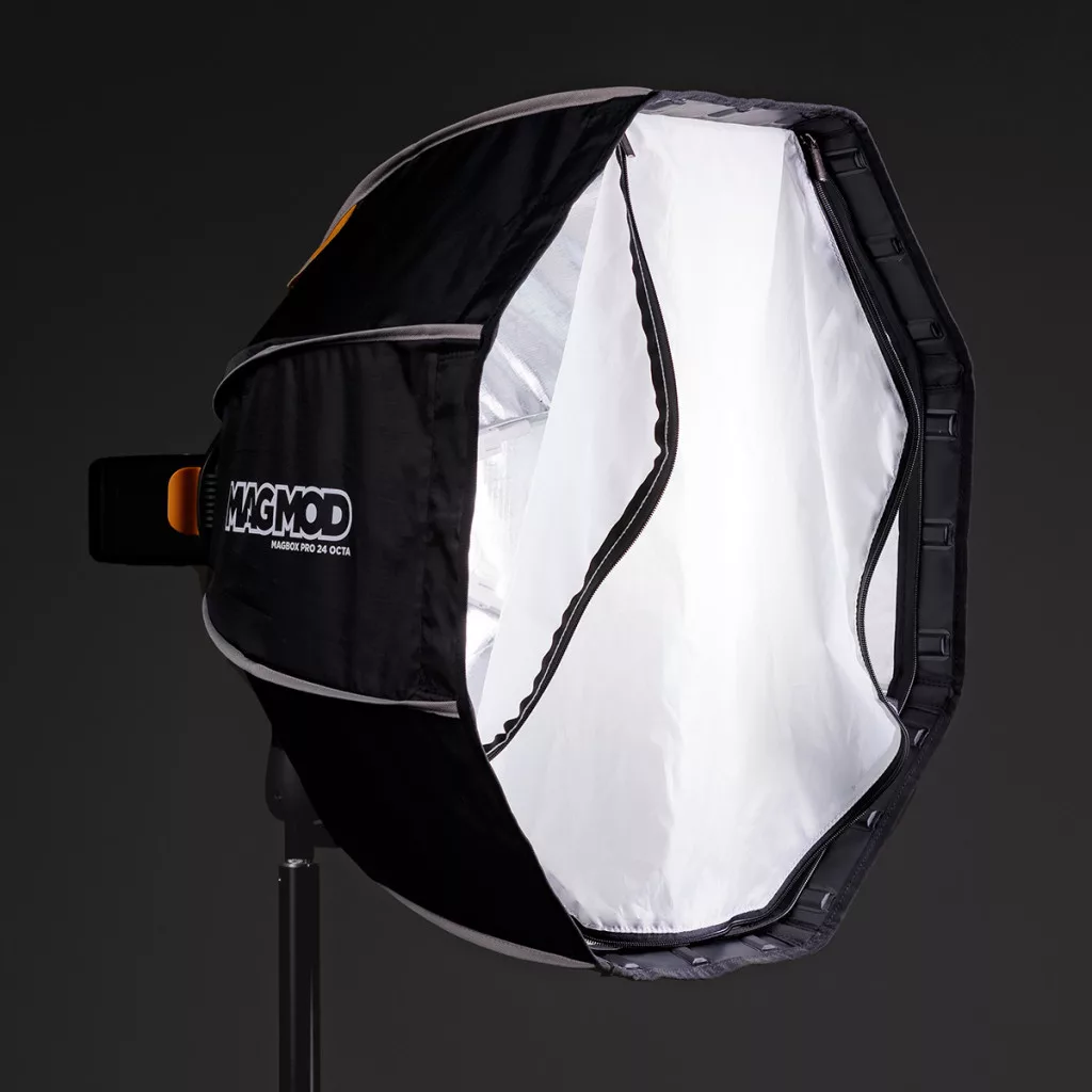 A MagMod Magbox Pro 24 Octa egy 24 hüvelykes Octa softbox, amelyet kimondottan gyorsfényszórókkal és stroboszkópokkal való használatra terveztek. A MagBox olyan időtakarékos funkciókat kínál, mint a szupergyors cipzáras diffúzor és az integrált beépített tárolózseb a diffúziós panelhez. A mágneses rögzítésű méhsejtrács segítségével egyszerű a fényszabályozás, így gyorsan és hatékonyan alakíthatja a fényt. Az egyszerű beállítás és a problémamentes fel- és leszerelés ideálissá teszi az elfoglalt fotósok számára a kamerán kívüli softbox világítás mozgatását. A MagBox rendelkezik integrált zselé nyílással az azonnali színezéshez MagBox zselékkel, ami tovább növeli a kreatív lehetőségeket.