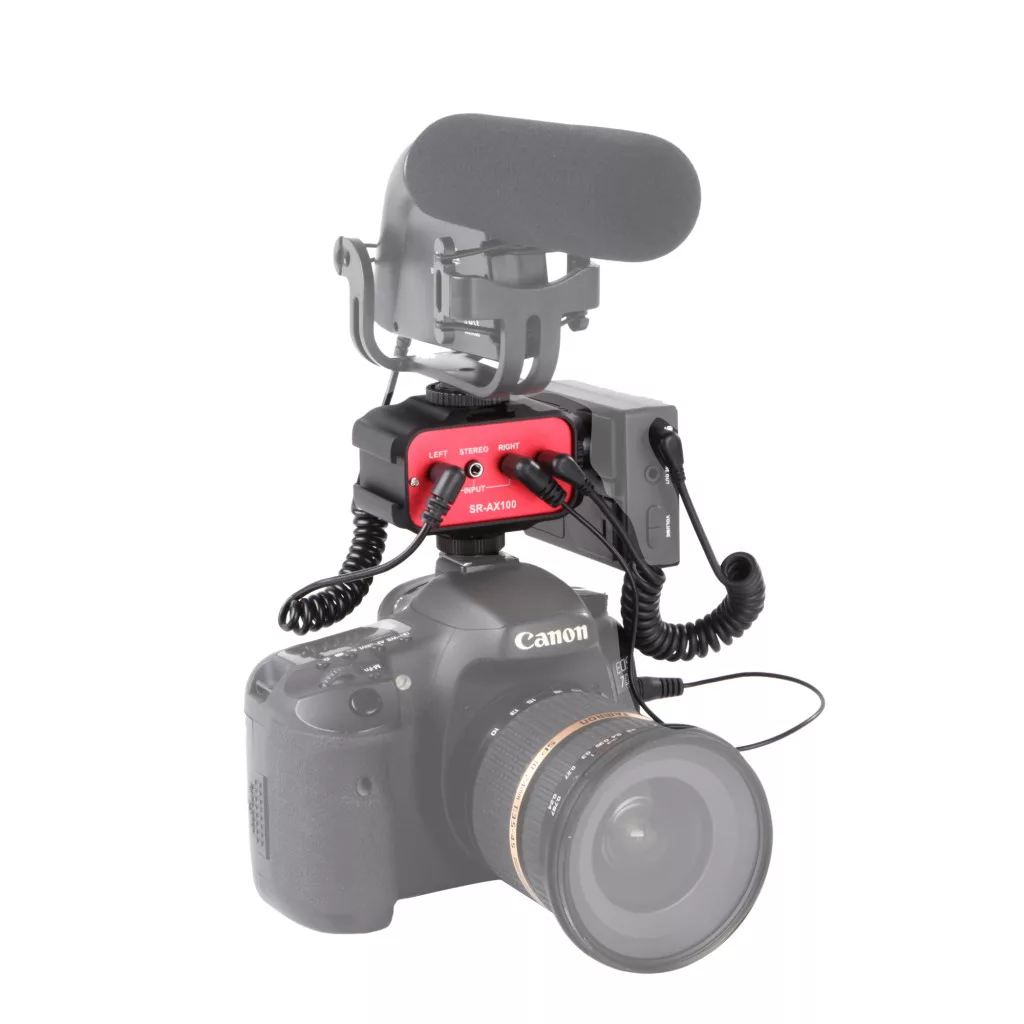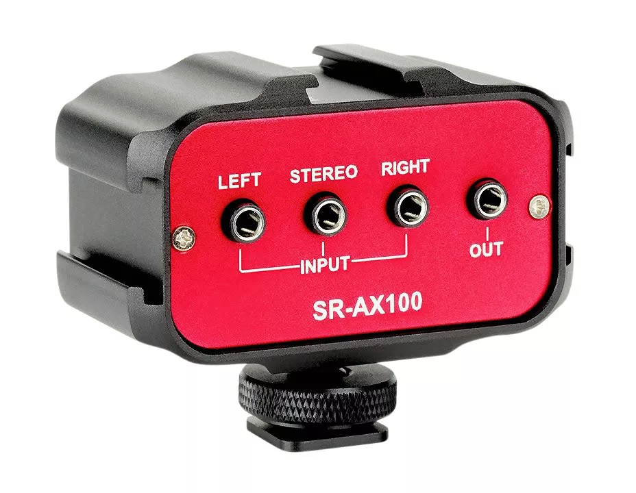 Az SR-AX100 adapter passzív áramkört használ, így gyakorlatilag zajmentes működést garantál, és nem igényel elemeket vagy különálló áramforrást. A kompakt kialakításnak köszönhetően könnyedén hordozható, így bármilyen forgatás során könnyedén használhatja.